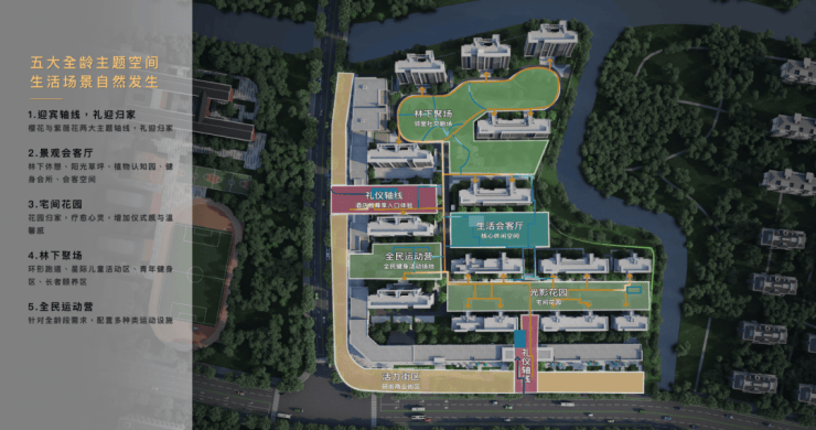 景观设计:四时花园、500米环形跑道、全龄活动区