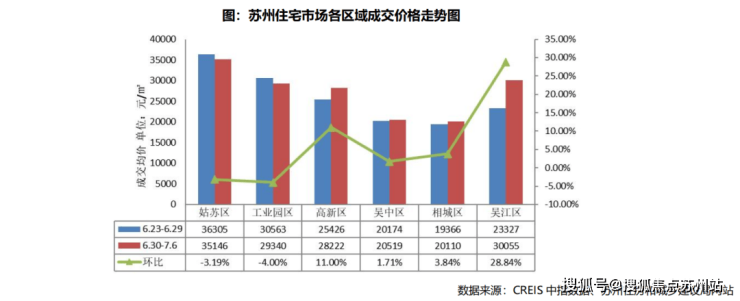 本周成交均价最高的为姑苏区 35146 元/㎡,环比下跌 3.19%;其次为吴江区,成交均价 30055 元/㎡,环比上涨 28.84%。本周全市住宅均价 25727 元/㎡,环比上涨 6.89%。