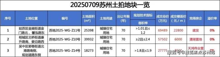 1、姑苏区金阊街道地块(苏地2025-WG-Z11号)被建发以6.95亿元总价摘得,楼面价22800元/㎡,容积率仅1.2,将打造高端低密社区。