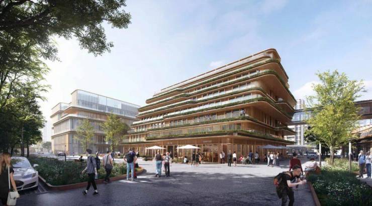 商业中心:紧邻养老中心西侧,建筑退台设计,种植丰富垂直绿化。