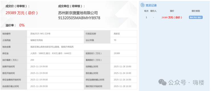 苏地2025-WG-Z26号,由苏高新地产底价竞得,楼面价1.8万/平,总价2.94亿,土地面积:16007平,容积率仅1.02。