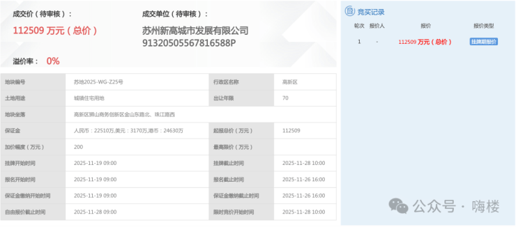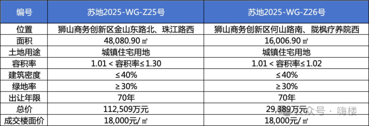 苏地2025-WG-Z25号,由苏高新城发底价活动,总价11.25亿元,楼面价:18000元/平。土地面积:48081平,容积率仅1.3。
