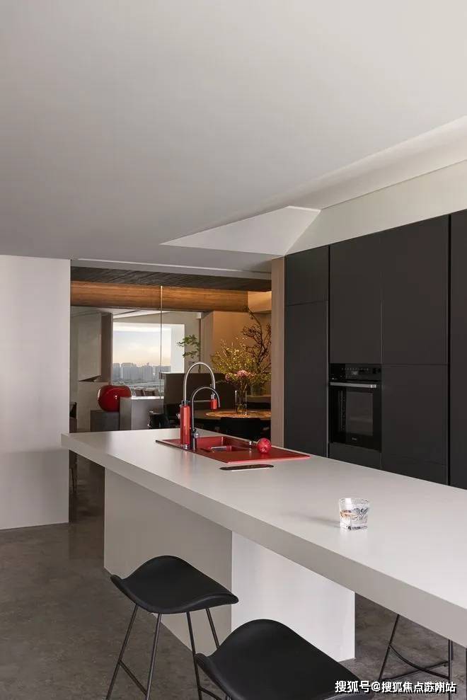 厨房、餐厅、吧台的结合十分轻盈,松弛的生活态度随处可见,厨房位于角落处,让油烟终止在角落,为其他区域带来了更多的舒适感。