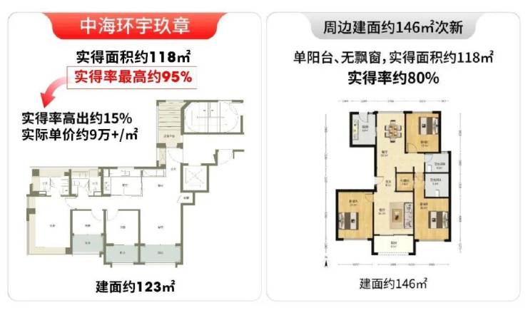 项目约123㎡户型,实得率最高约95%,而周边非新规 / 二手房实得率普遍只有约80%。