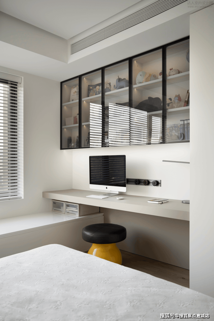 次卧通过丰盈的功能性展现房屋居住者的待客之道,不大的卧室在进行了精致分区后,充分利用墙面和边角区域,做出了梳妆台、更衣区、休息区以及收纳柜,床体周围的空间进行了“完美三分离”,满足客人的任何需求。