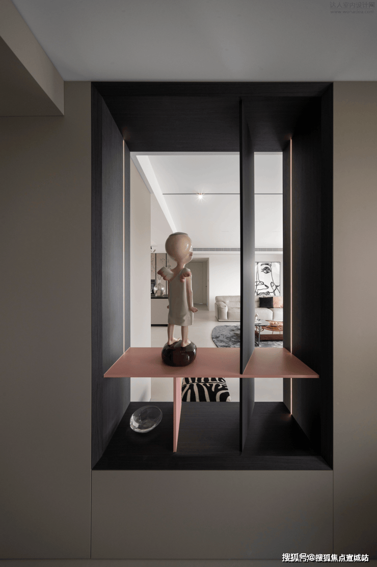顺着客厅后侧的走廊,就能到达卧室。透过艺术格栅的缝隙,还能望见客厅的光景。