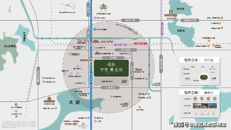 这里的交通网络四通八达,中环线串联全域枢纽,约15分钟就能到达姑苏主城、狮山核心区、金鸡湖CBD,大大提升了通勤效率。从中环东边可以连接园区产经引擎,西边融入狮山创新脉络,南边承接太湖新城生态蓝图,北边开启高铁枢纽经济,便捷通达苏州各个中心,真正实现了"出则繁华,入则宁静"的理想生活状态。