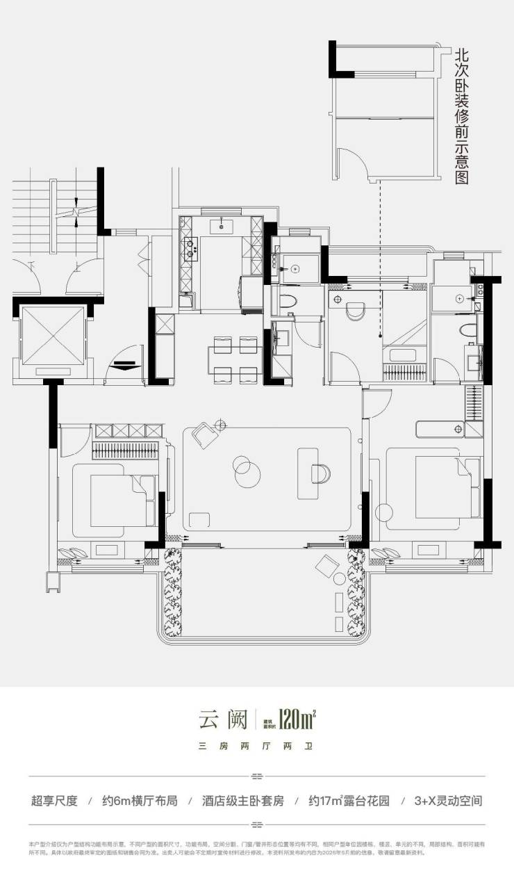 云阙户型:建筑面积约120平方米的三房两厅两卫,比青岚户型更大一些,居住更加舒适,适合追求品质生活的家庭。