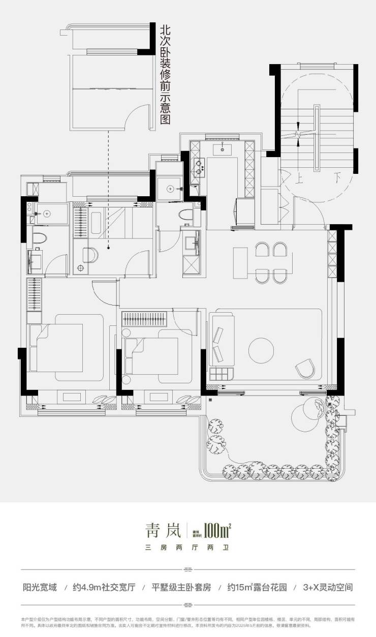 青岚户型:建筑面积约100平方米的三房两厅两卫设计,空间布局合理,功能齐全,非常适合年轻夫妻或者三口之家。