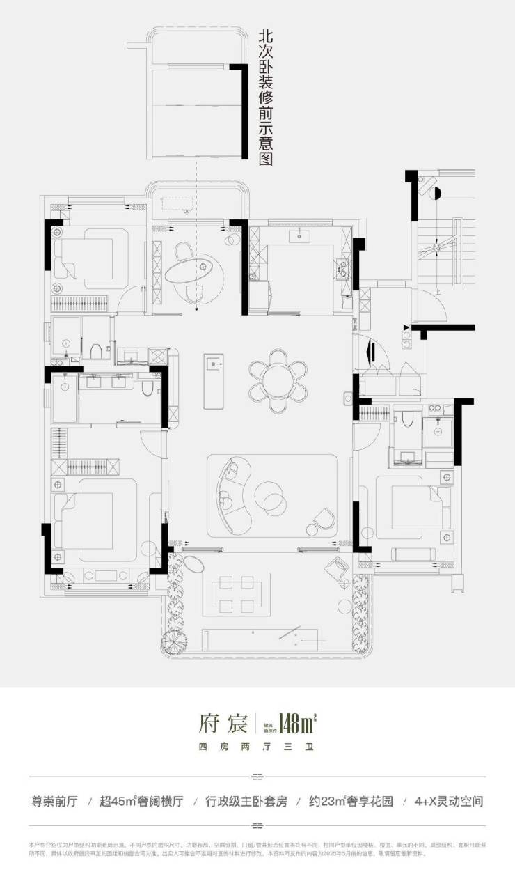 府宸户型:建筑面积约148平方米的四房两厅三卫,空间宽敞,功能分区明确,无论是三代同堂还是二孩家庭都能满足,是改善型住房的绝佳选择。