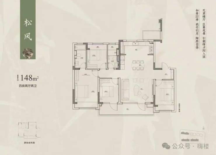这次公布的户型,诚意十足。洋房主力是约148㎡的四房,专为三代同堂的家庭设计。亮点是四个房间都朝南,南向面宽有约14.6米,阳光能从早晒到晚。客厅开间约5米,和餐厅、厨房、阳台连成一体,特别显大,一家人互动也方便。主卧是带独立卫生间的套房,私密性好。