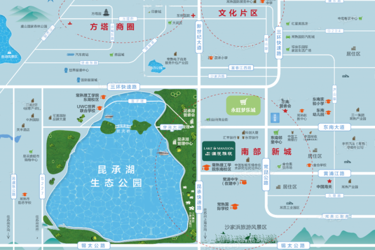 澜悦雅筑项目与全国县级市中少有本科院校常熟理工学院东南校区紧邻,西侧一路之隔即为常熟市境内较大的湖泊之一——昆承湖.地块周边景观、商业、教育、交通等配套优质,在建永旺梦乐城约18万㎡,是目前常熟市较大的商业综合体,预计2019年6月正式开业。片区在建常清中学预计2020年投入使用。