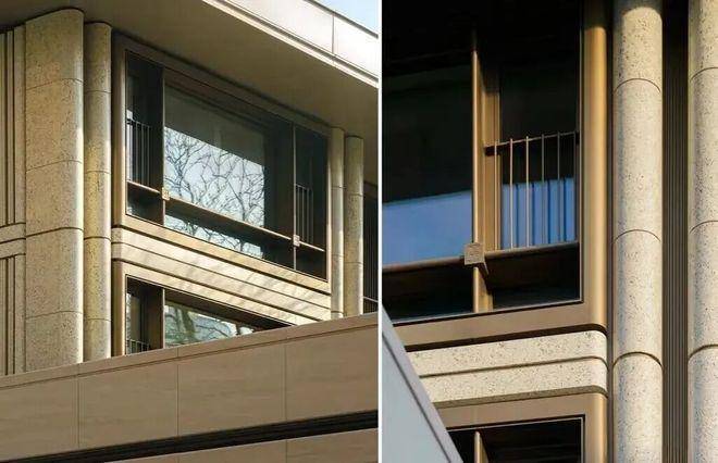 比如,立面采用 米黄色石材,仿古铜色的金属线条 ,再配合大面积玻璃的通透视感,超高的窗墙比,高级感不言而喻。 弧形元素 在外立面上大量运用,使建筑呈现出柔和而不失庄重的美感。