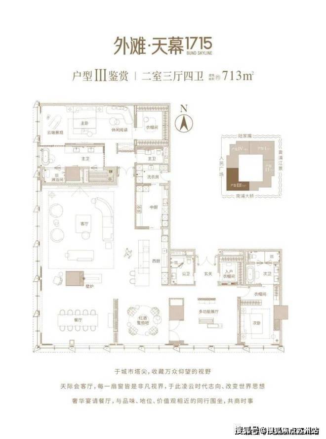 上海黄浦外滩·天幕1715售楼处电话☎:400-8123-664(售楼处预约看房热线)270°面南向大宽厅,南北通透,光景绝佳.开敞视野自成气度,雍容舒展,窗内、窗外皆可作“景”,内敛深刻中畅贯优雅情调自然延伸.