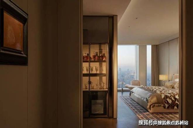 走道端处香槟色金属雕塑,形类城市高楼,又若恋人彼此依偎;全采光套房拥揽白日上海黄浦的忙碌、繁华,也收藏夜晚灯火阑珊的宁静、美好.