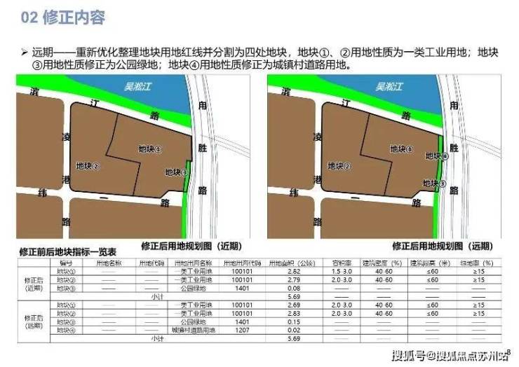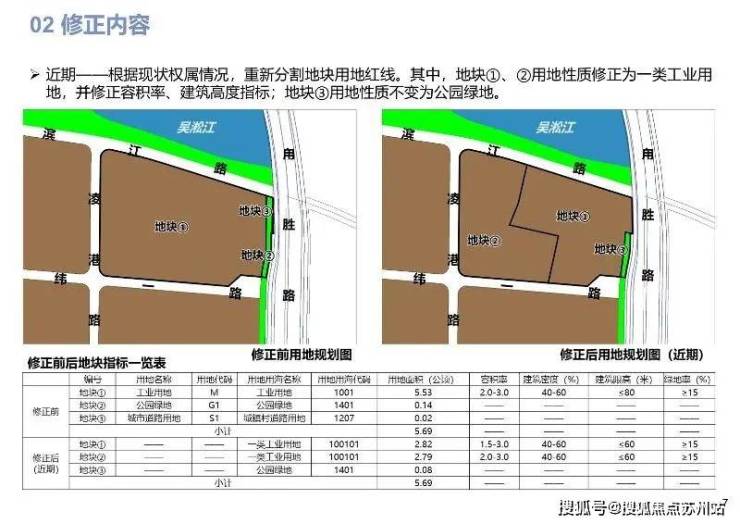 修正内容:近期--根据现状权属情况,重新分割地块用地红线。其中,地块①、②用地性质修正为一类工业用地,并修正容积率、建筑高度指标;地块③用地性质不变为公园绿地。