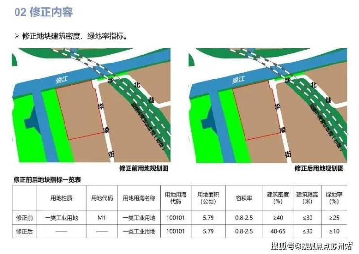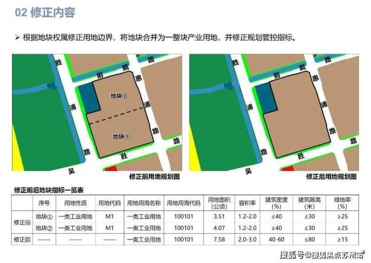 修正内容:根据地块权属修正用地边界,将地块合并为一整块产业用地,并修正规划管控指标。