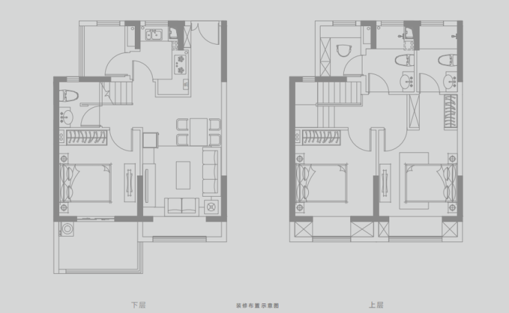扶光·奢境 | E户型 约112㎡(复式) 这是上下两层的复式,空间感强,功能分区明确。楼上楼下都有卫生间,使用方便。四个房间朝南,采光极佳。进门有独立玄关,归家仪式感满满。