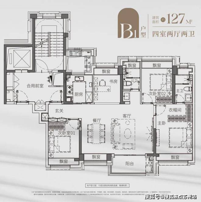 来看看更大一点的户型——建面约127㎡超阔四房,同样是南向横厅设计,并拉伸至4开间,空间舒阔。主卧套房设计,也有足够的收纳,打造专属秀场。