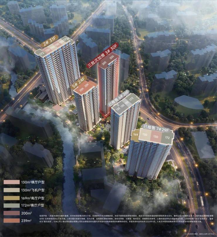 户型面积:主力户型为130㎡、169㎡、172㎡、200㎡和240㎡,涵盖3-5房。