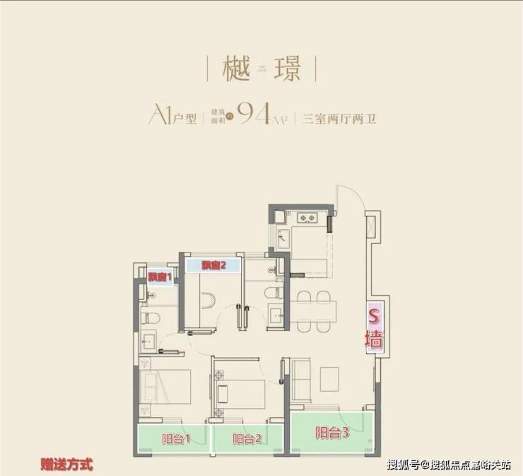 约94㎡起步户型:设计了市场上不多见的南向三阳台,凭借充足(约9%)的赠送面积,实现空间利用率最大化。