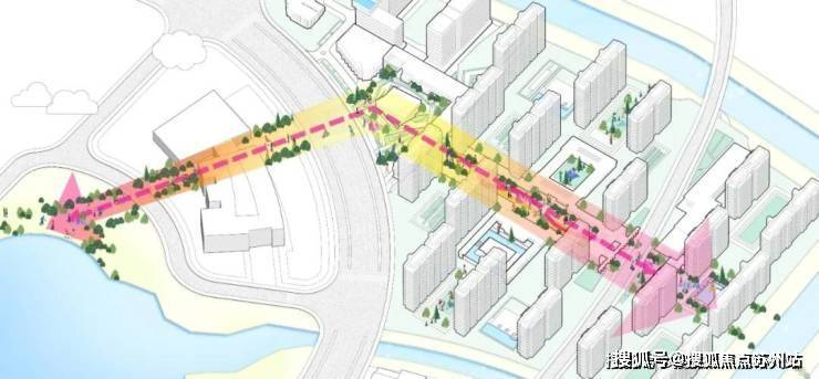 开放共享轴链接各个节点:生态运动休闲带,生态林荫大道,街区绿地;形成连续的绿色公共、半公共空间。并在绿地中注入国际文化特点的商业配套,形成尺度宜人的街道和建筑尺度。