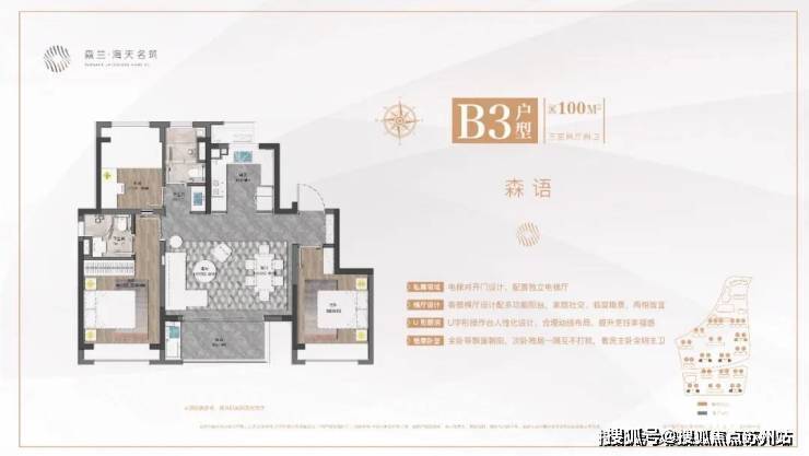 1、建面约100㎡三房两厅两卫,市场主流户型。客餐横厅设计配多功能阳台,优势在于更大采光面和更好通风效果,把过道纳入到客厅和餐厅的空间中来,使整体空间得到更好的利用。