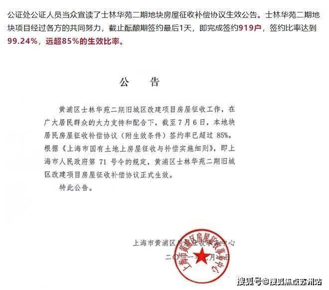 作为黄浦旧改地块,项目2011年启动第一轮意愿征询,意愿征询98.97%通过。同年7月,地块房屋征收补偿协议生效公告发布。