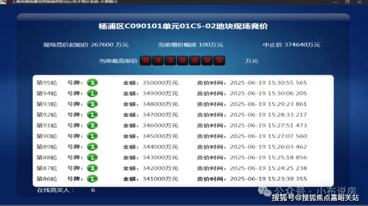 6月19日,保利发展经过95轮竞价摘得杨浦东外滩地块,成交总价350000万元,楼板价95530元/㎡,溢价率30.79%.