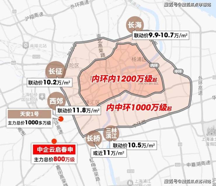 其次,内中环不管是杨浦、普陀、徐汇普遍约11万/㎡+,更别说像前滩、徐滨已13-14万/㎡+。