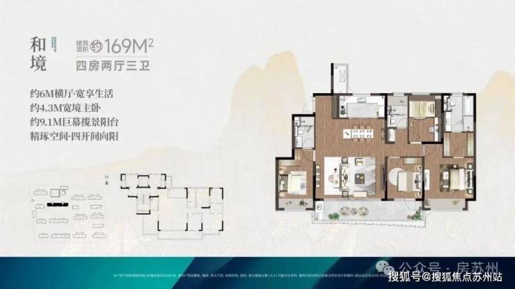 169平方米的四房三卫户型是真正的豪宅享受,同样采用专梯入户设计,独立门厅和大容量玄关收纳。南向五开间设计,超过16.5米的采光面,全天候宽幕采光,致敬生活的艺术。客餐分区设计,专属私享大横厅,南北通透效果极佳。全屋有270度环幕观景阳台加四重飘窗,美景尽揽入怀。主卧同样是酒店式套房设计,宽绰的衣帽间和卫浴间,私享尊贵生活。
