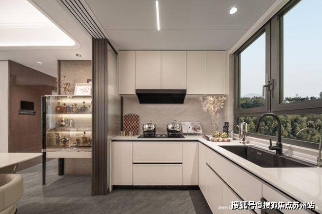 厨房整体空间上呈方正的形状,招商时代潮派售楼处电话:400-8123-664操作台L字型排布。厨房集成吊顶,采用蜂窝铝板+LED嵌入式条形灯+欧普(或同等档次品牌)线性凉霸。墙面采用马可波罗(或同等档次品牌)900*1800mm爵士白主砖,台面选用的是人造石,拉通到岛台侧面一体化铺贴。