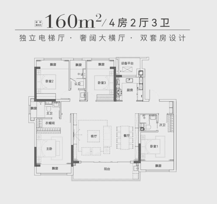 约160㎡四房: 拥有独立的电梯厅,私密性超好。客厅是奢阔的大横厅,视野开阔,而且是双套房设计,主人和长辈都有独立尊享空间。