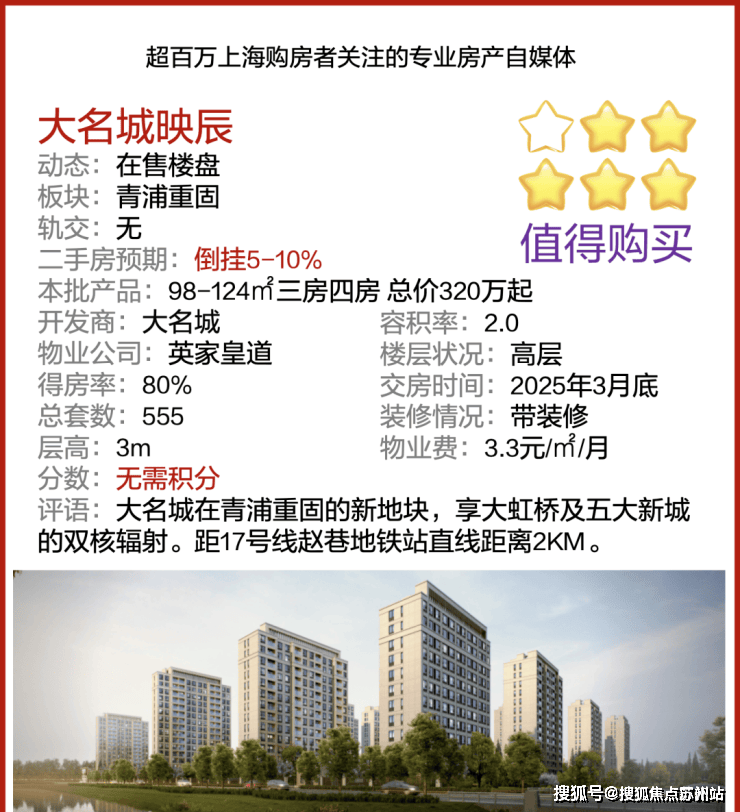 其次,对比大虹桥,大虹桥新房普遍6万+/平方米,二手房则更是突破9万/平方米(如蟠龙天地、万科天空之城等),而车行时间相距仅约15分钟的大名城·映辰仅3.48万/平方米,价差明显,相当于新房的58折,二手房38折。