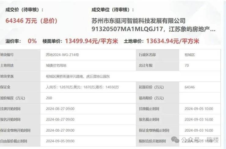 由苏州瑞嘉商业发展有限公司(苏州历史文化名城发展集团)以底价竞得,成交总价13197万元,楼面价20500.19元/m²,溢价率0%。
