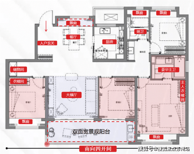 还有建面约143㎡四房两厅两卫,四开间朝南,每个功能空间都做到了均好性。