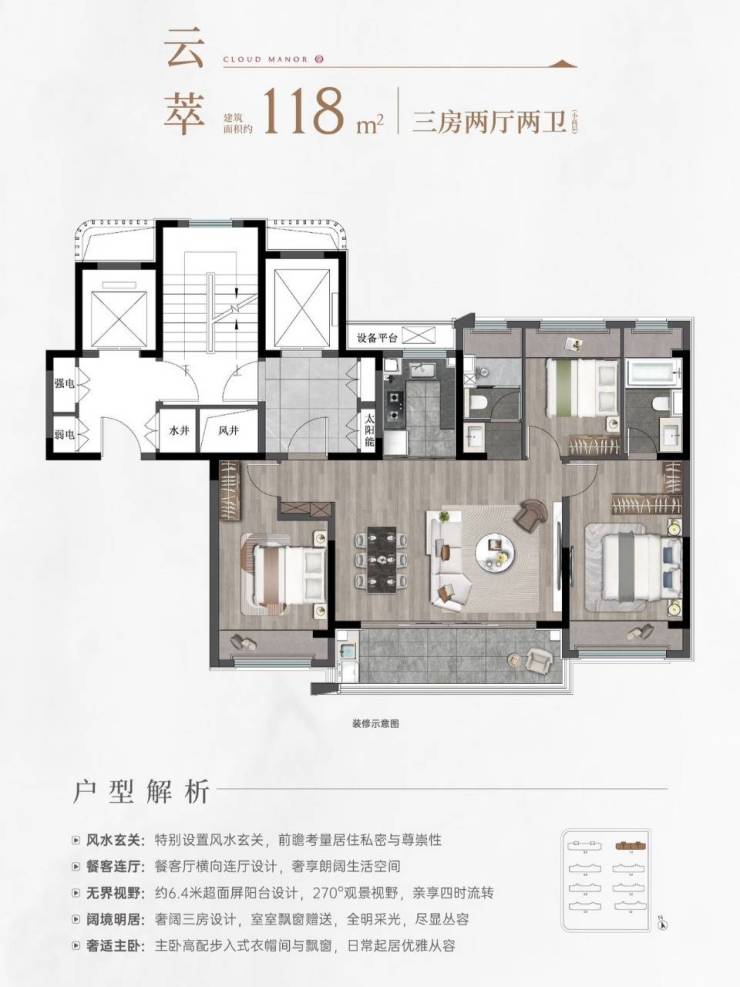 精装交付:带三大件(中央空调、地暖、新风)的精装修,省心省力。