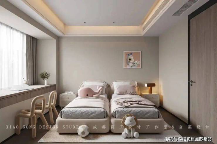女儿房的硬装是简约耐看的。床品和挂画点缀了莫兰迪粉,映衬着这个空间无比温馨舒适;小屋造型的置物架充满了童趣。