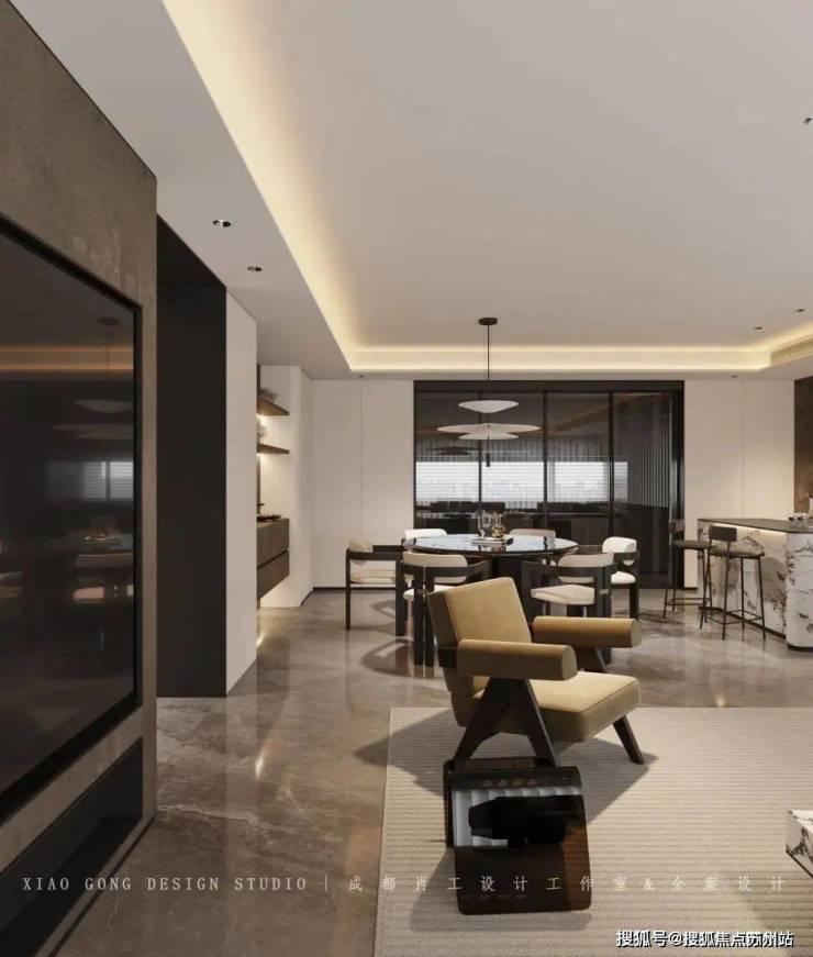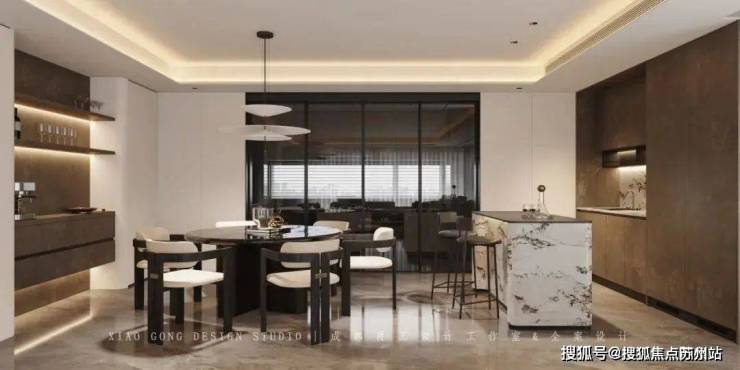 独立岛台+大理石餐桌,提升了餐厅的颜值,也增加了空间的使用舒适度。岛台一侧的艺术铜纹柜面和客厅相互呼应,让空间更有秩序感 。