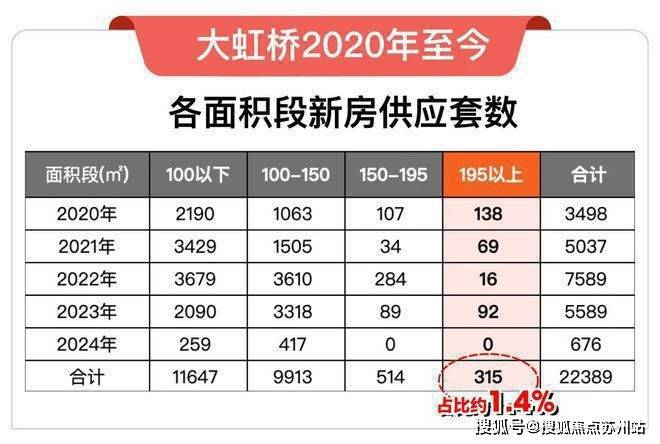 虹桥润璟2020年至今,大虹桥共供应22389套新房,其中建面约195㎡以上户型仅315套,今年为止更是0供应(截至2024.4.9),占比只有约1.4%。