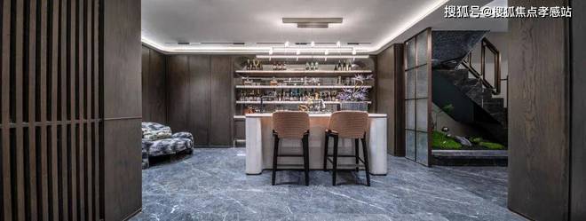 车库入口,以颇具艺术感空间的坡道尺度,配合雪山兰奢石墙面,追光式的灯带设计,营造层层递进的礼序感。