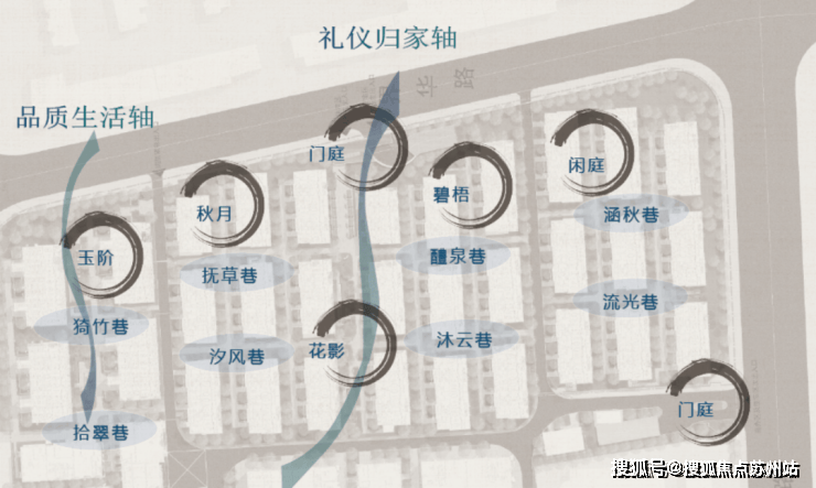 “玉阶、闲庭、碧梧、花影、秋月”五大院落,打造八巷生活场景,涵盖流光巷、涵秋巷、沐云巷、酌泉巷、汐风巷、抚草巷、拾翠巷、猗竹巷。