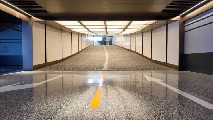 地面采用钢纤维混凝土基座与精磨石面层,这类做法通常出现在机场、商业综合体等高承载空间,不仅更耐磨、防渗、抗压,也让车行时的声响变得沉稳,不会产生廉价的震动颗粒感。