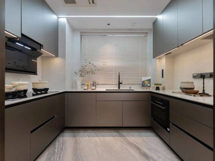 厨电方面,配备国际一线品牌博世四件套(三眼灶台、壁挂式侧吸油烟机、15套大容量洗碗机、蒸烤一体机),水龙头和水槽则选用了科勒。更亮眼的是,厨房还配了日立厨房空调。