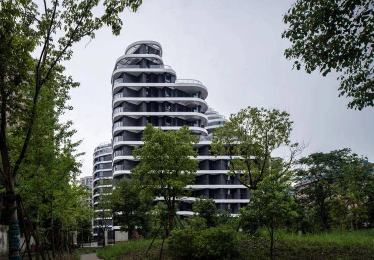 外立面采用玻璃幕墙现代简约风。建筑轮廓曲线蜿蜒,呈波浪线型层层迭高并后退,时尚感非常强。