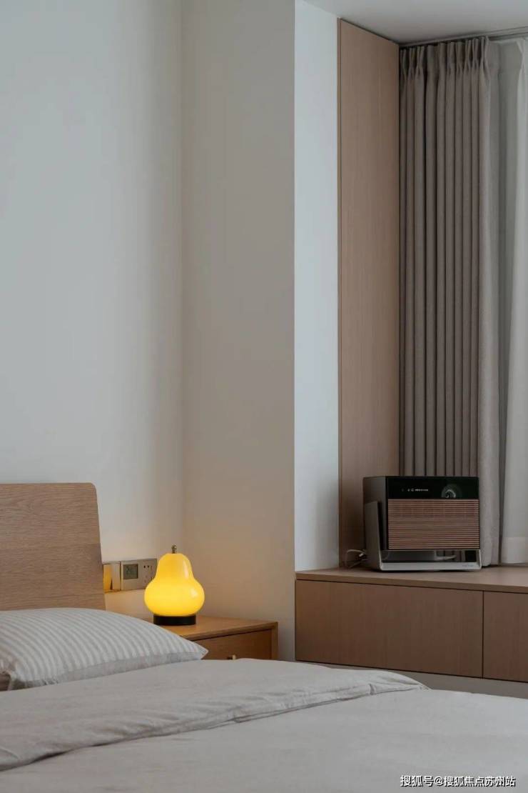 主卧的设计更是将温馨舒适发挥到了极致。实木床与床头柜,每一寸木纹都诉说着时间的痕迹,让人感受到家的踏实与温暖。飘窗不能拆除,但设计师巧妙地将其改造成了储物柜,既满足了储物需求,又保留了飘窗的浪漫。
