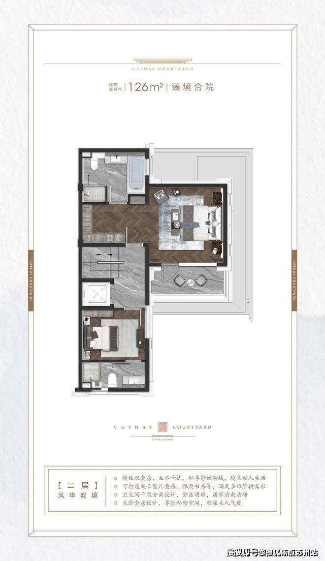 建面约126㎡的合院户型,同样适合三代同堂,或者三口之家以及高净值年轻夫妻等家庭。