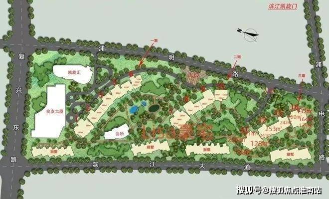 【滨江凯旋门】位于浦明路、规划滨江公共绿地、潍坊西路、张杨路共同围合而形成,占地面积约60788平方米,总建筑面积15.6万平方米,容积率2.4,绿化率35%,启胜物业14.8平米/月,滨江凯旋门三期总建筑面积约4万平米,最高楼层只有23层,582套住宅和23套沿江联排别墅(未售),还有一栋酒店公寓【凯旋汇】组成。