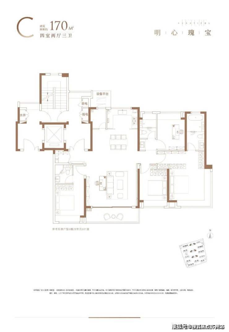 该户型在约107㎡户型基础上有所提升,增加了1个北向卧室空间,更适合三代同堂或多孩家庭改善居住~建面约170㎡4房2厅3卫