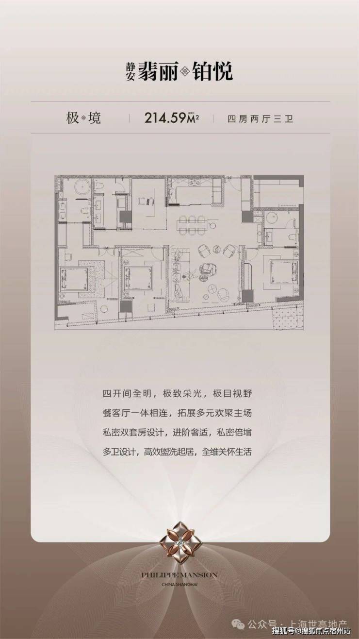 - 极境214㎡:4房双套房,四开间全明采光,餐客厅一体化拓展社交主场。
